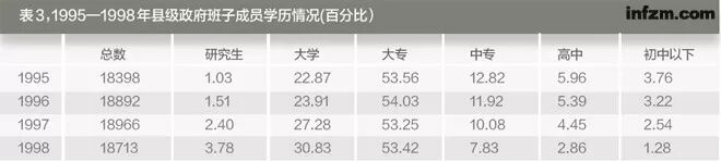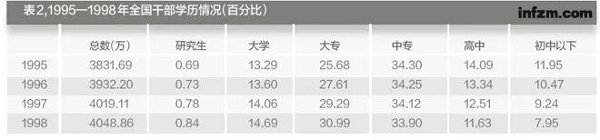 自1995年开始,统计趋于细致。这表现在:其一,学历类别划分更细,特别是增添了研究生和大专生学历;其二,学历上有了干部的分层统计,这样,统计中既有全国干部学历的总体情况,也有省地县三级干部学历的情况,极大地便利了人们全面、具体地了解我国干部的学历。1999年出版的《中国干部统计五十年》及2000年出版的《中国共产党组织史资料》向社会呈现了上述翔实的统计数字。关于1998年以后干部学历的统计数字,笔者更愿意用以分析比较的是干部总体、省地县领导班子成员的历年学历,无奈没法找到,唯一能够找到的是各届中共中央委员的学历。