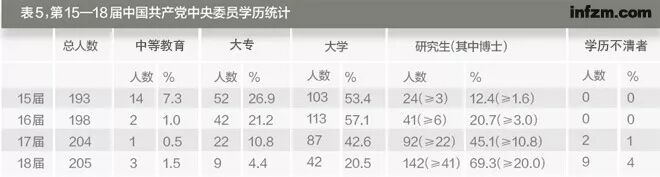 第二,第18届中央委员中研究生、大学、大专学历分别占69.3%、22.5%、4.4%,即大专以上学历占96.2%,大学以上学历占91.8%,研究生学历者近七成,基本都是高学历。