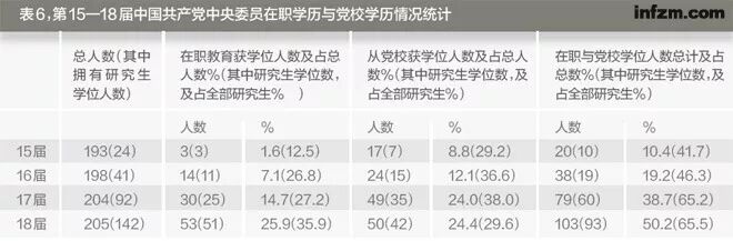 第三,51%的第18届中央委员的个人最高学历是从“在职教育”和“党校学习”中获取的。在全部第18届中央委员的研究生学历中,近三分之二(65.5%)是从“在职教育”和“党校学习”中获取的。准确地说,23.9%的中央委员拥有全日制的研究生学历,45.4%拥有“在职”和“党校”的研究生学历。前一比例(23.9%)绝不算低,后一比例(45.4%)则堪称惊人。